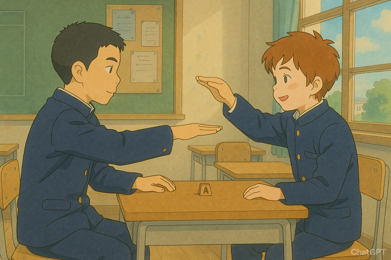 두 사람이 책상을 사이에 두고 마주보고 책상위에 동전이나 종이를 올려 놓는다.