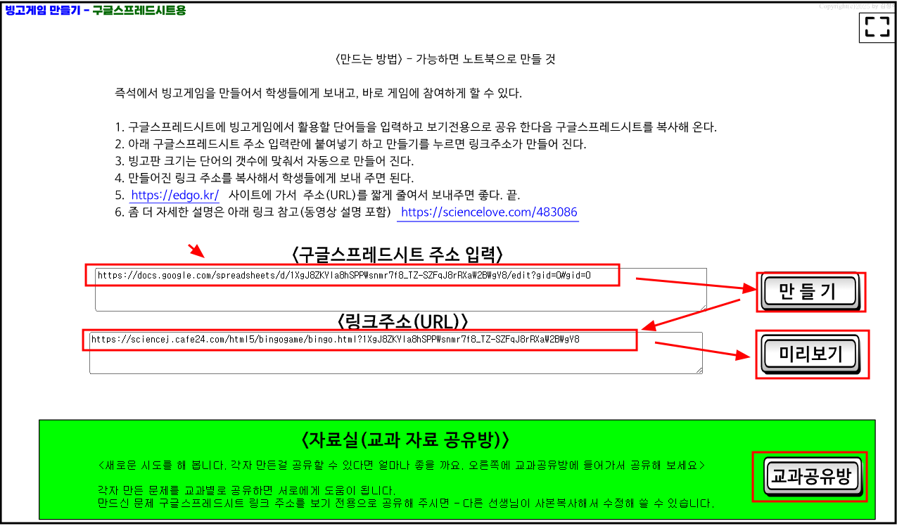 2. 아래 링크에 가서 복사한 구글스프레드시트 주소를 붙여넣기 하고 만들기를 누르면 된다.