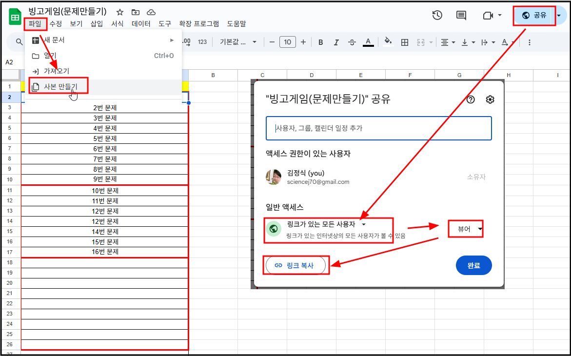 1. 구글스프레드시트를 사본 복사해서, 보기전용으로 공유하고, 링크를 복사한다.