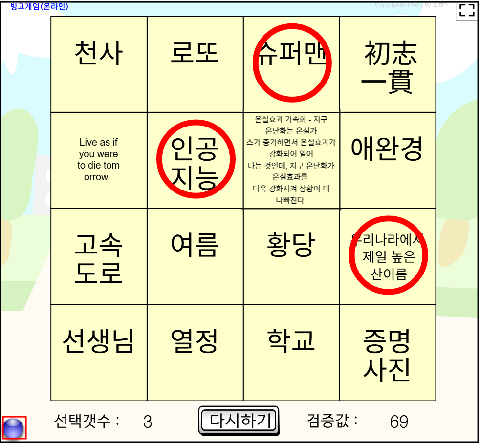4. 학습내용을 다 공부시키는 것이 중요하니, 빙고가 나오더라도, 마지막 1문제만 빼고 끝까지 게임을 진행한다. 그럼 모든것이 동그라미가 쳐 지고, 한개만 남아 있을 것이다. 그럼 선생님이 칸 번호를 임의로 부르고 남아있는 단어가 그 번호와 맞으면 점수를 부여하면 된다.