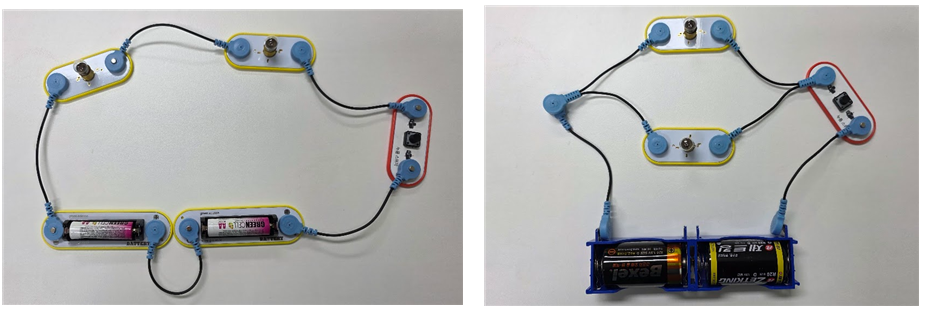 저항의 직렬 병렬 연결에서 전원장치를 사용해도 되지만, 간단하게 전원장치 대신 건전지를 사용할 수 있다(대부분 교과서에서는 건전지를 사용한다). 그리고 오른쪽 병렬 연결처럼 건전지 끼우개를 구입하지 않고 기존에 학교에 있던 건전지끼우개를 이용해도 된다.