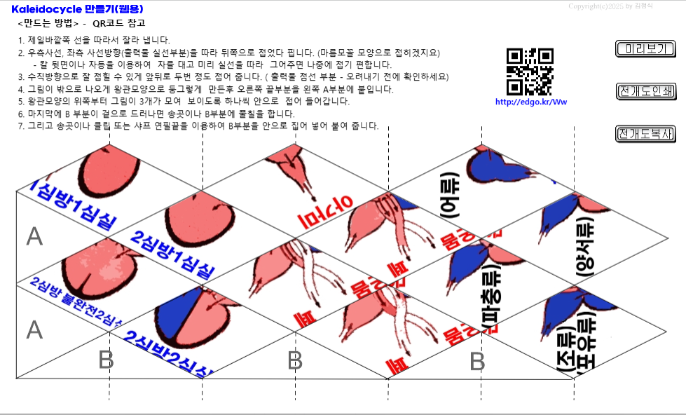 어류, 양서류, 파충류, 조류및 포유류의 심장구조입니다.첨부된 화일을 출력해서 접으면 됩니다.직접 본인이 제작하고 싶으면 아래사이트에서 프로그램을 받아서 만들 수 있습니다.https://sciencel