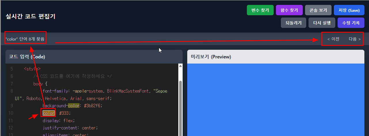 코드 입력창에서 내용을 수정하면 바로 미리보기 창에 반영되는 걸 볼 수 있다.