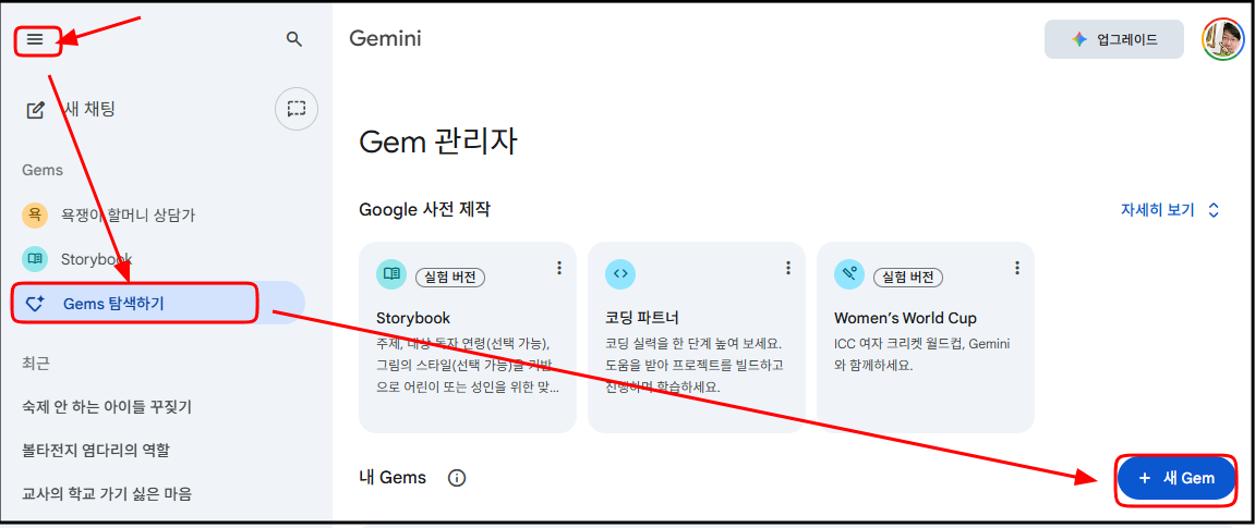 1. 제미나이에 접속(https://gemini.google.com/)해서 왼쪽 메뉴중에 Gems 탐색하기 누르고 들어가서 +새 Gem 누르고 만들면 된다.