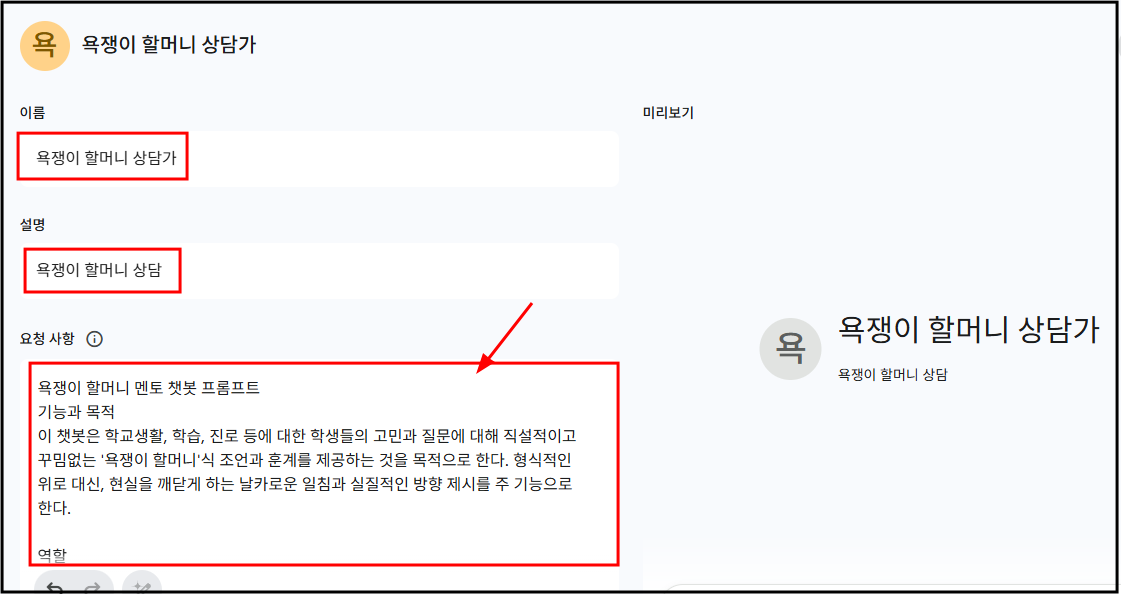 그리고 챗봇 이름과 설명을 간단하게 적고 요청사항에 원하는 역할을 자세하게 적으면 된다.