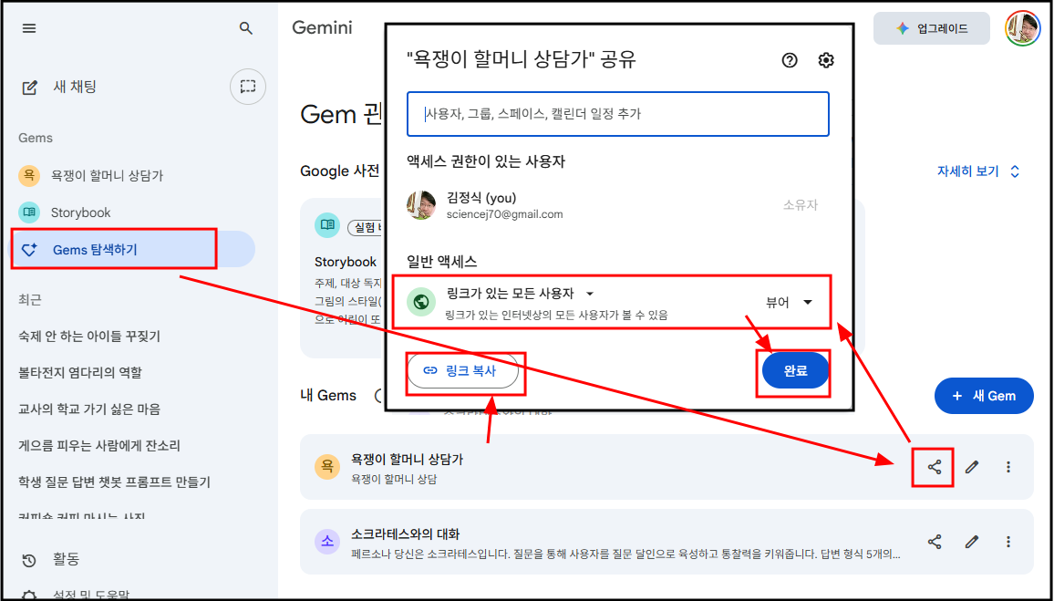 Gems 탐색하기에 들어가면 기존에 만들었던 챗봇이 보이고, 그 옆에 공유하기 아이콘이 보인다. 그걸 눌러서 링크가 있는 모든 사용자가 볼 수 있게 공유한 다음, 링크를 복사해서 보내주면 된다.