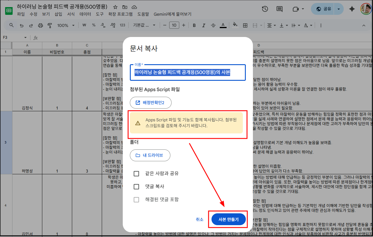 사본 복사할 때 Apps Scripts 파일도 함께 복사 된다.