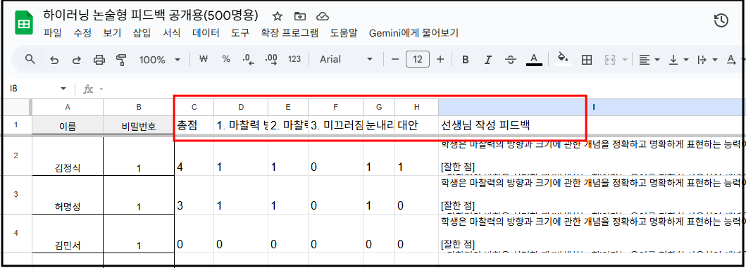하이러닝에서 AI 서∙논술형 평가 채점이 끝난후 내려받은 결과 엑셀파일에서 필요한 내용만 복사해서 구글스프레드 시트에 넣어 주면 된다.