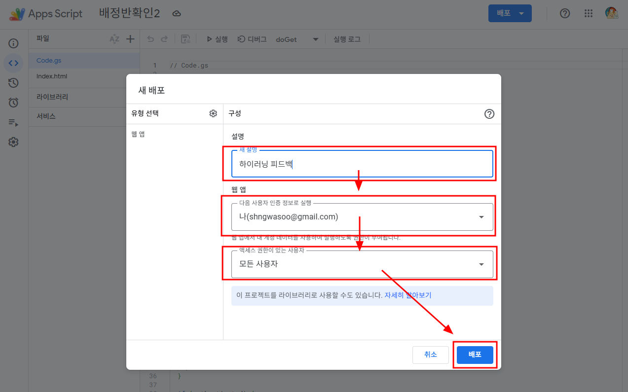 5) 새설명에 제목을 넣고 웹앱과 엑세스 권한은 그림처럼 설정하고 배포를 누른다.