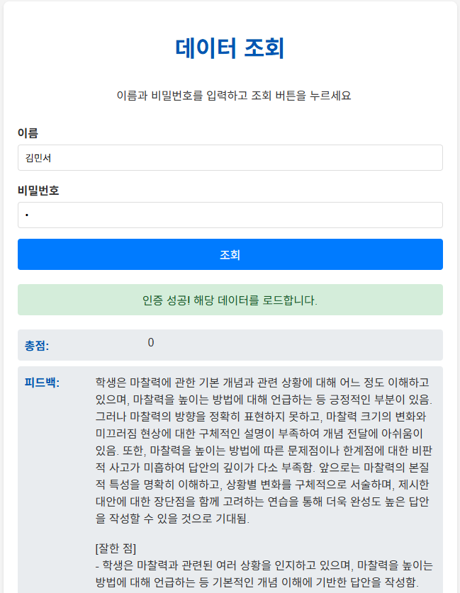 AI 피드백을 바탕으로 선생님이 최종 점수를 확정하고 피드백을 작성해서 저장을 하면