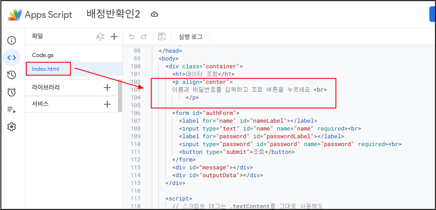3) 그대로 사용해도 되지만, 학생 검색창에 나올 내용을 바꾸고 싶으면 Index.html 에 가서 아래 붉은색으로 되어 있는 설명 부분을 수정하면 된다. (일단 이건 그냥 넘어 가자)