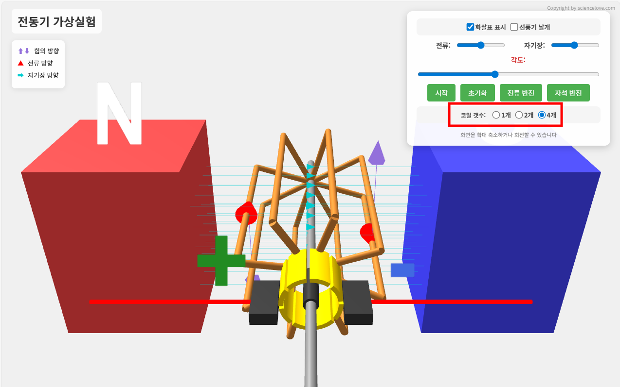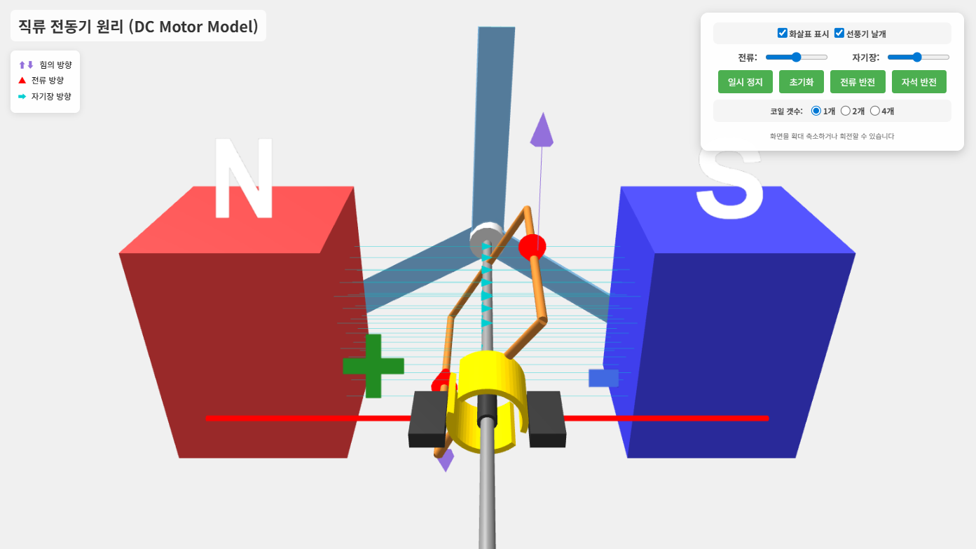 전동기 원리를 교육하기 위해 만든 가상실험 프로그램입니다. 관찰자의 위치를 바꿔가며 입체로 관찰할 수 있도록 해서 문제에서 제시되는 다양한 형태의 전동기 모습을 만들어 볼 수 있습니다