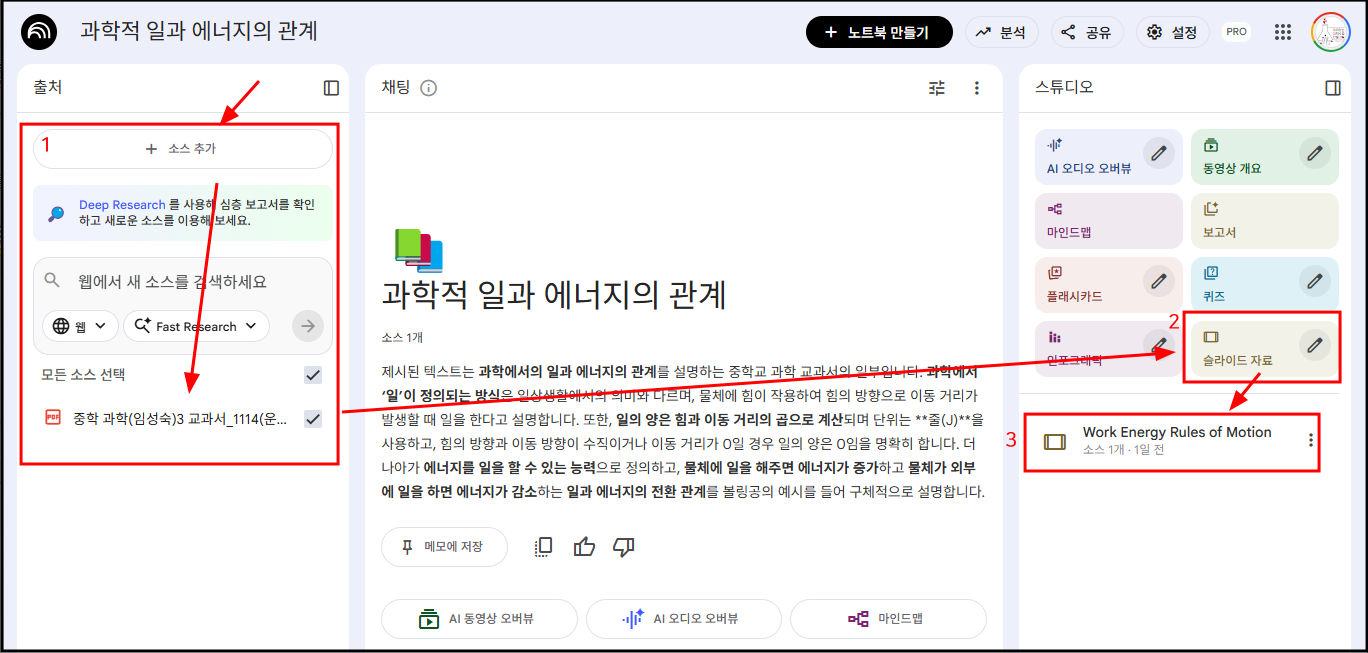 - 필요하면 소스 추가를 눌러 화일이나, 웹사이트, 또는 유튜브 영상등 원하는 자료들을 추가로 담을 수 있다.