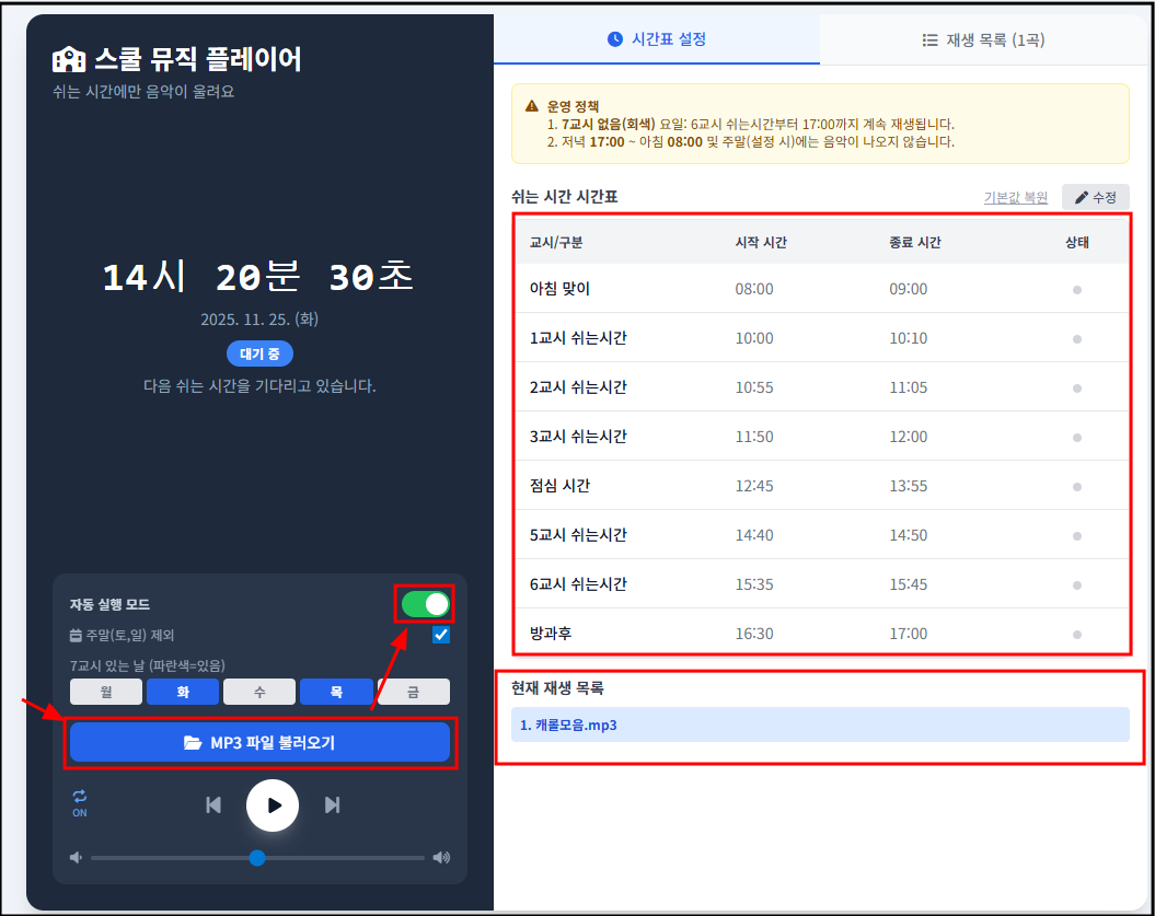 5. 방과후 시간이나 이른 아침 시간에는 자동으로 노래가 재생되지 않는다.