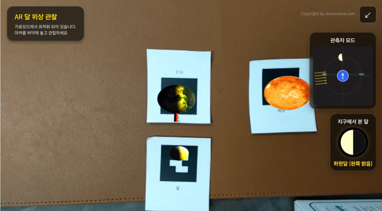 <학생들은 하현달을 잘 이해하지 못한다. 그럴 때는 관측자를 180도 회전시켜 하현달 쪽으로 향하게 하면 관측자 모드에서 왼쪽만 보이는 하현달을 확인할 수 있다.>