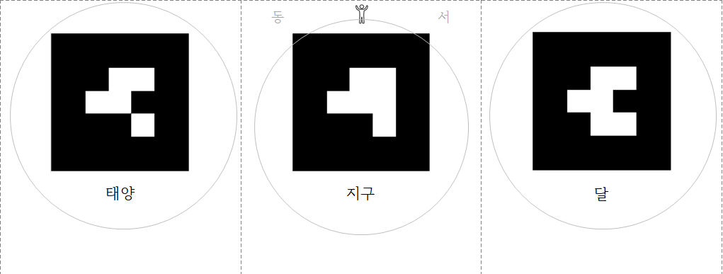 2. 마커를 출력해서 학생들에게 나눠 주고 태양, 지구, 달 마커의 위치를 이동시켜 가며 관찰하면 된다.