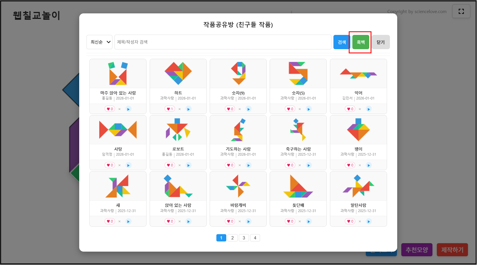 2. 불러오기를 누르면 친구들이 만든 작품공유방이 열린다. 친구들이 직접 만든 칠교놀이를 가져다가 맞춰 볼 수 있다.
