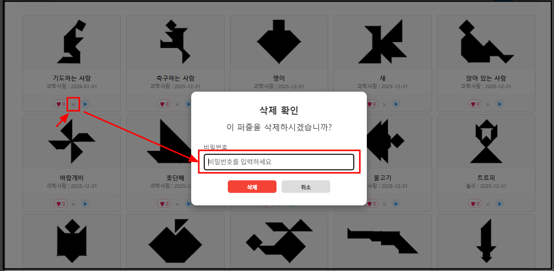 비밀번호는 기본 1234로 저장된다. 나중에 자신이 만든 칠교 조각을 지우고 싶을 때 비밀번호가 필요하다. 비밀번호를 입력해 놓면, 나중에 자신이 만든 칠교퍼즐을 검색해서 삭제할 수 있다. (기본으로 두면, 다른 친구들이 비밀번호 1234를 눌러 내걸 삭제할 수도 있다.)