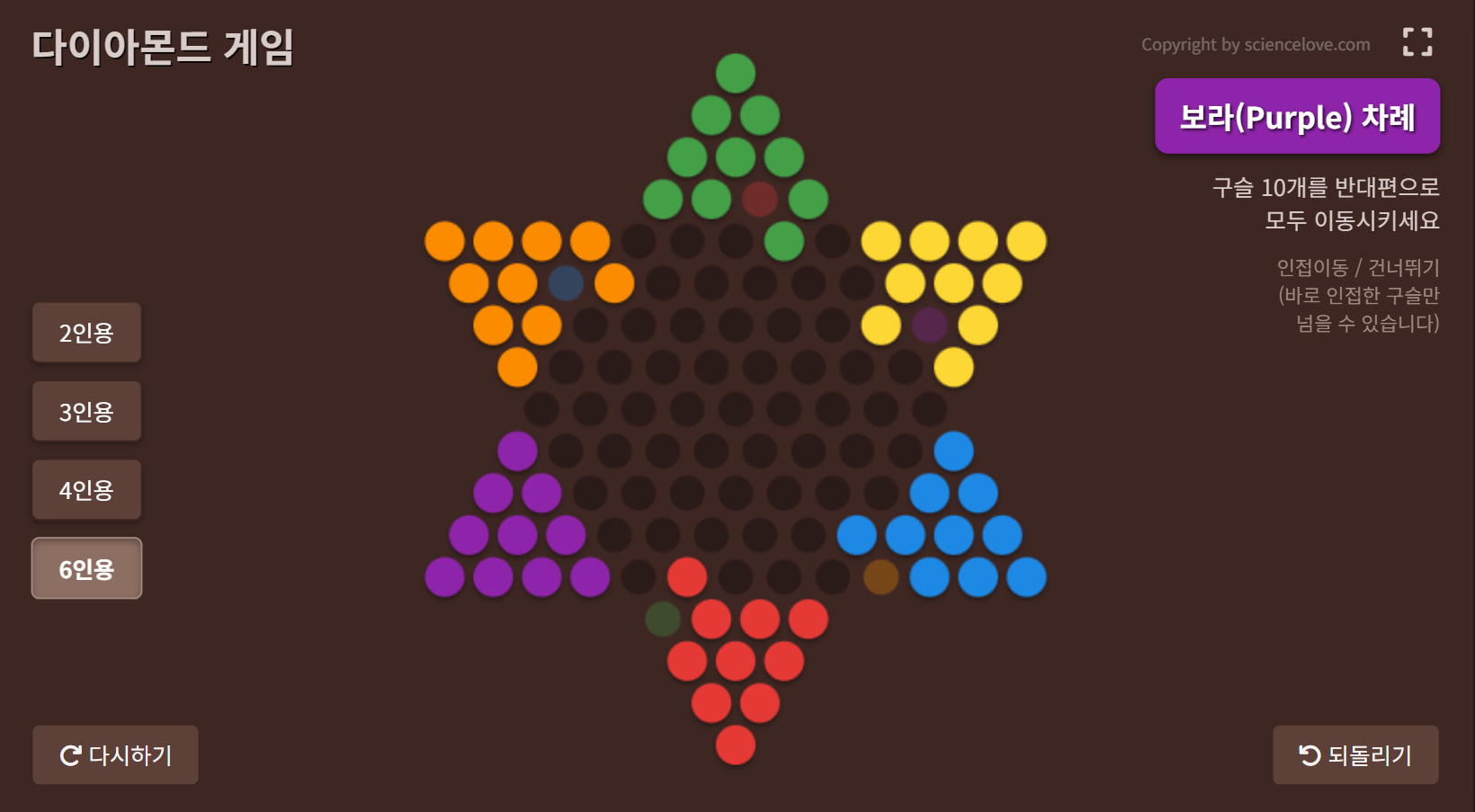 그래서 2명이서 6명까지 함께 할 수 있는 다이아몬드 게임을 만들어 보았다.