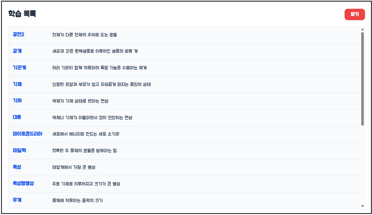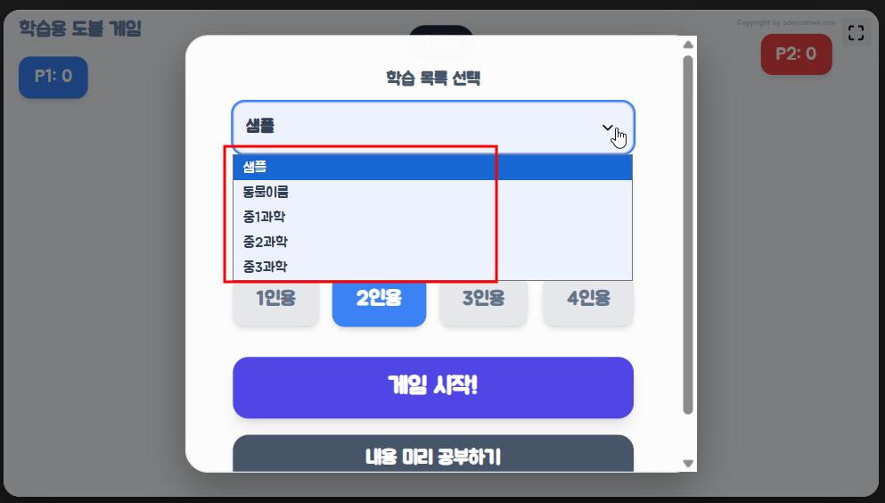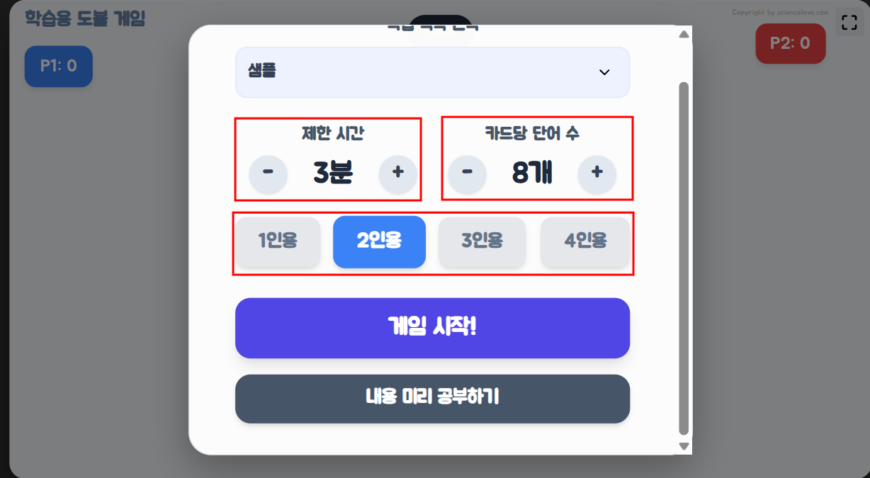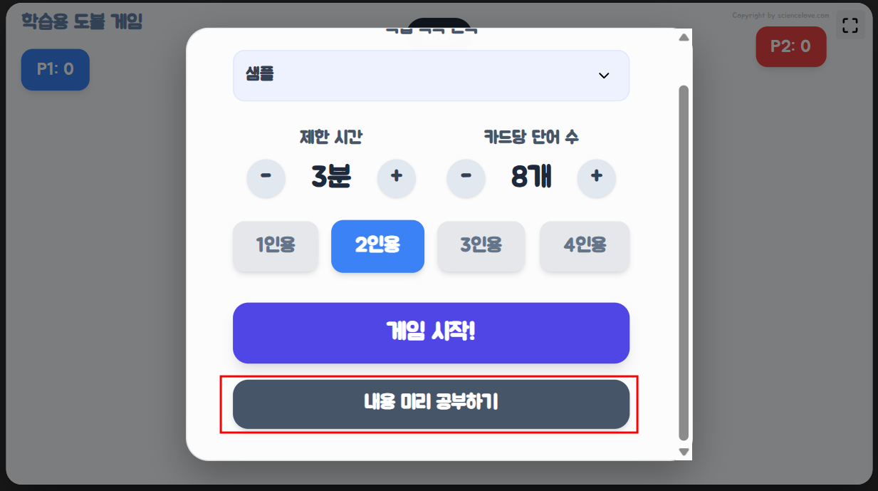 나. 학생들이 게임하기 전에 첫화면에서 내용 미리 공부하기를 눌러 미리 단어 내용을 공부할 수 있다.