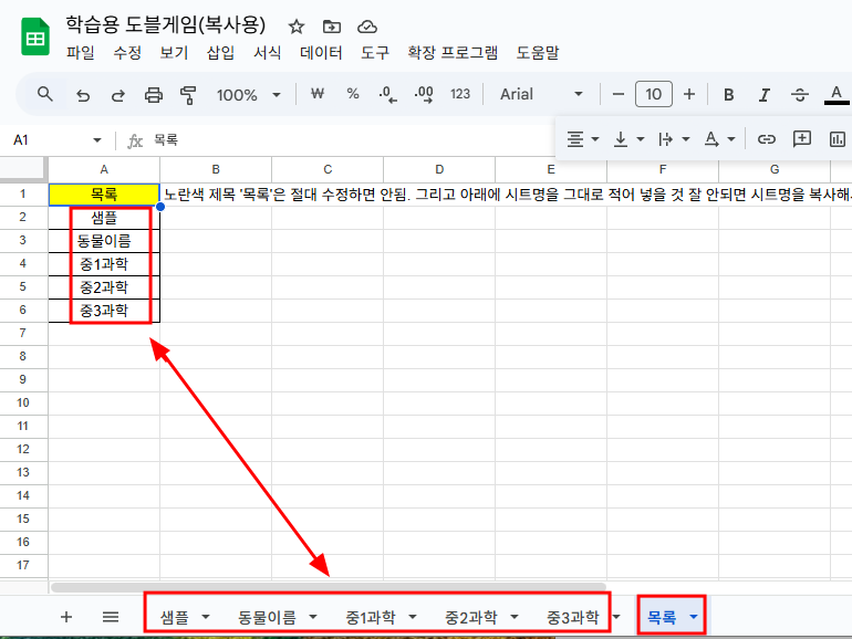 가. 제목을 누르면 학습용 도블게임과 연결되어 있는 구글스프레드시트가 열린다.