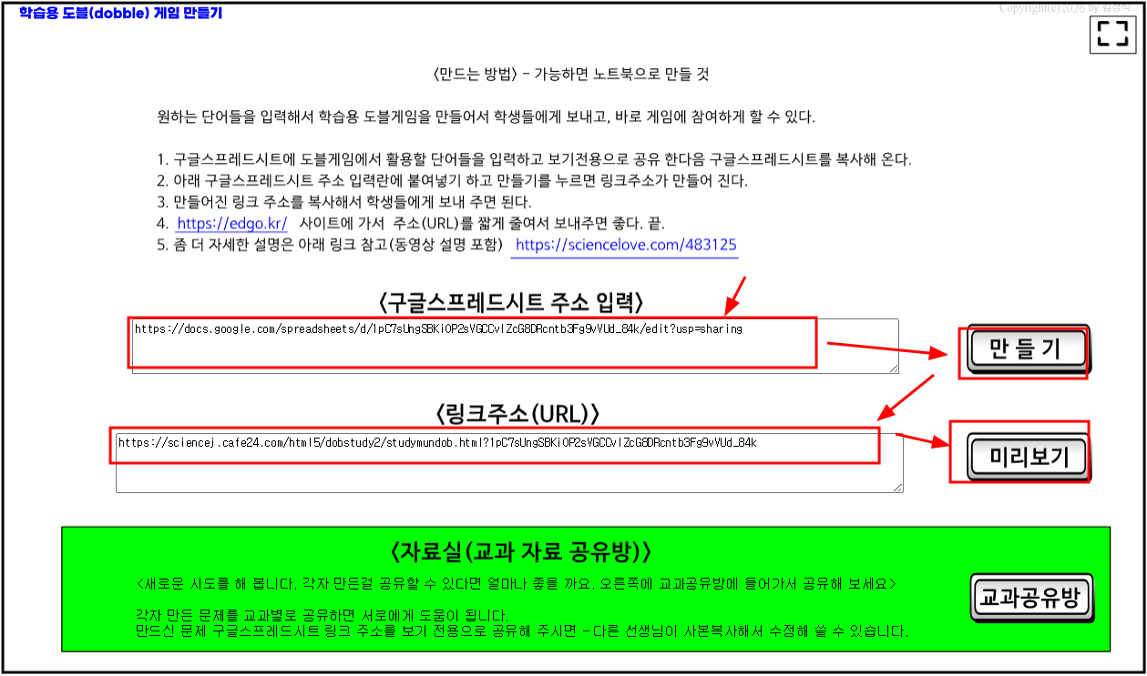 - 구글스프레드 시트를 만들었다면 아래 링크에 접속해서 학습용 도블게임을 만든다.