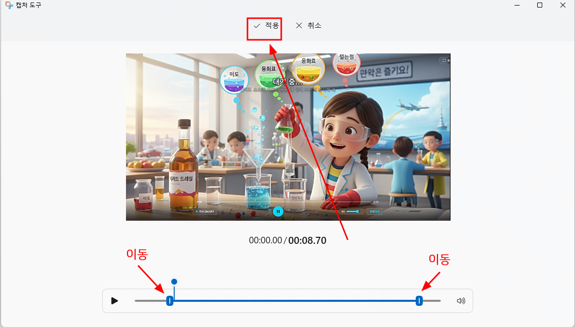 트리밍 화면 모습이다. 앞뒤 필요 없는 부분을 잘라내고 저장하면 된다.