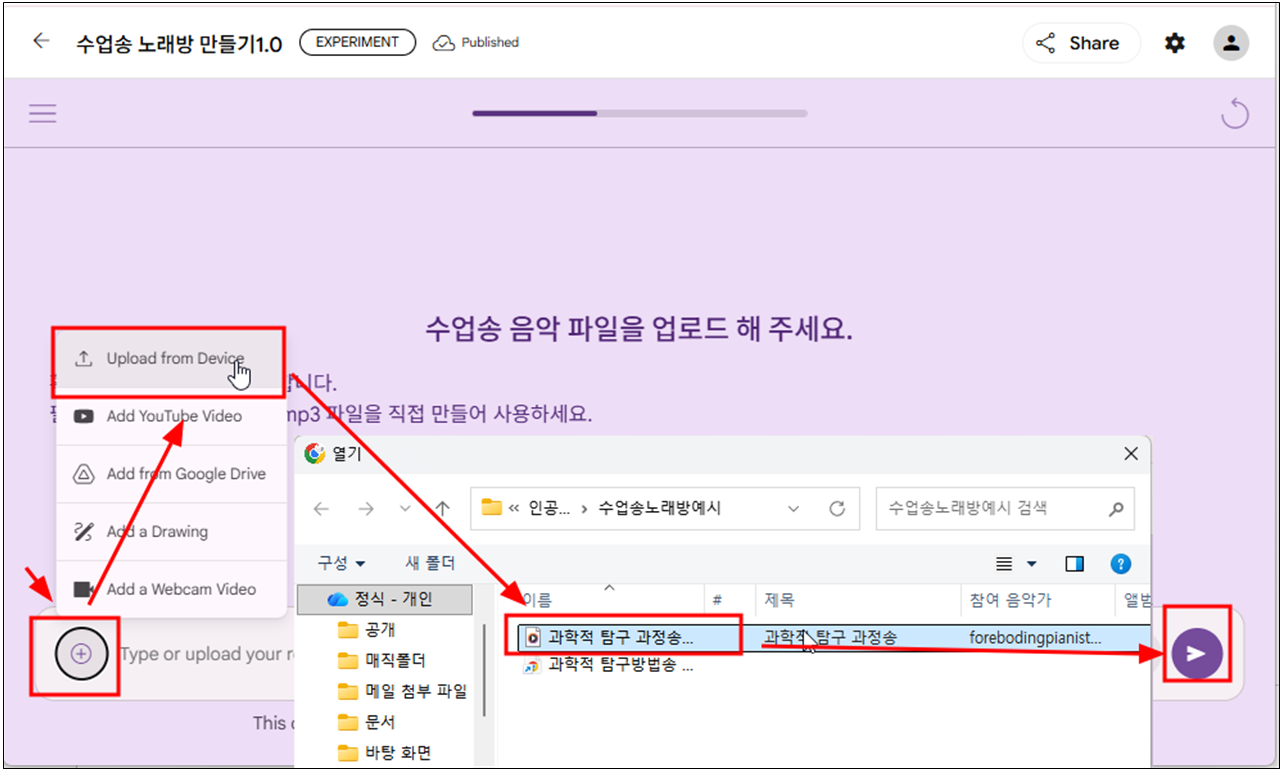 1) suno로 만든 수업송.mp3 파일 올린다.