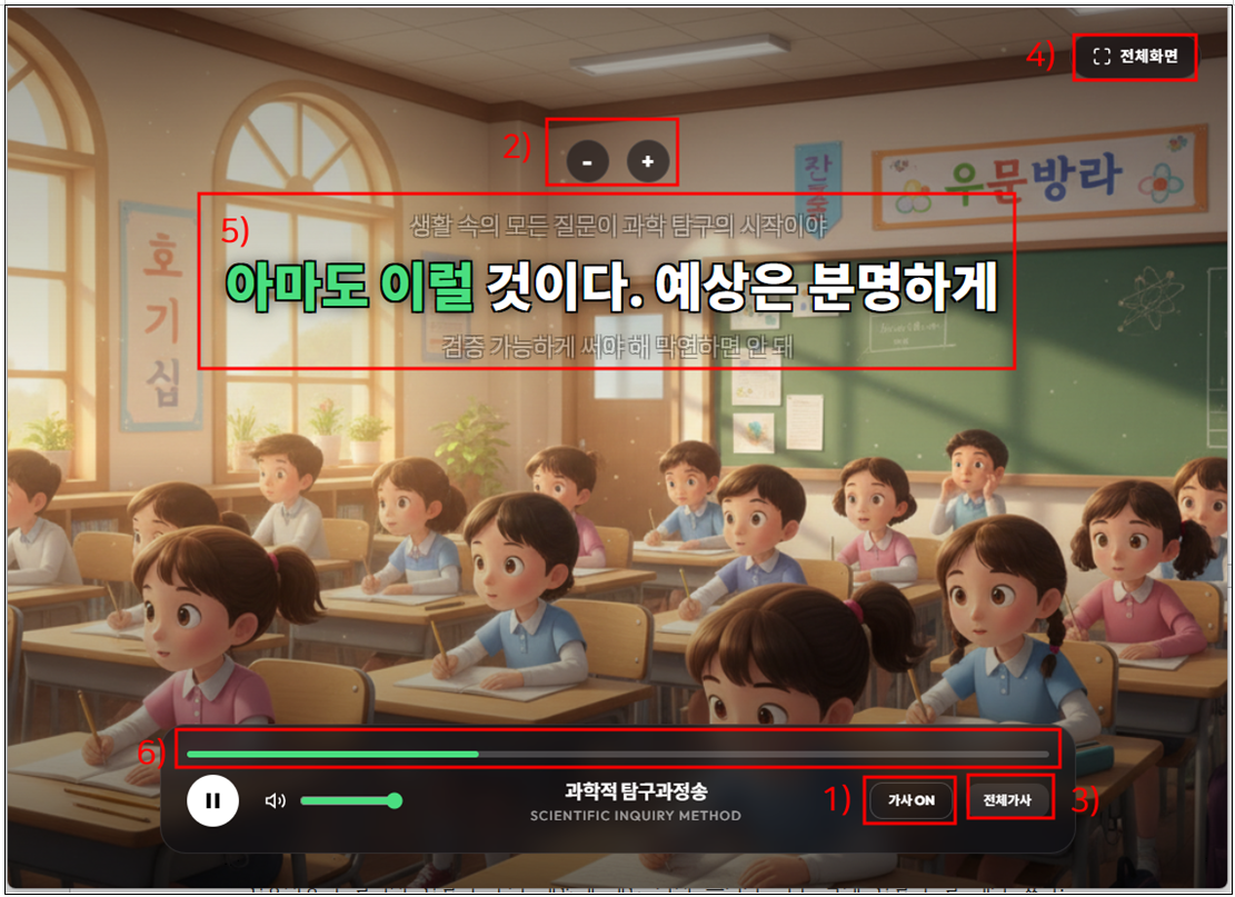인공지능이 만드는 것이기 때문에 다시 만들 때 마다 배경그림이나, 가사 배치등, 수업송 노래방에 포함된 요소들의 배치가 달라진다. 필요하면 같은 내용으로 몇개를 반복해서 만들어서 그 중에 가장 마음에 드는 수업송 노래방을 사용하면 된다.