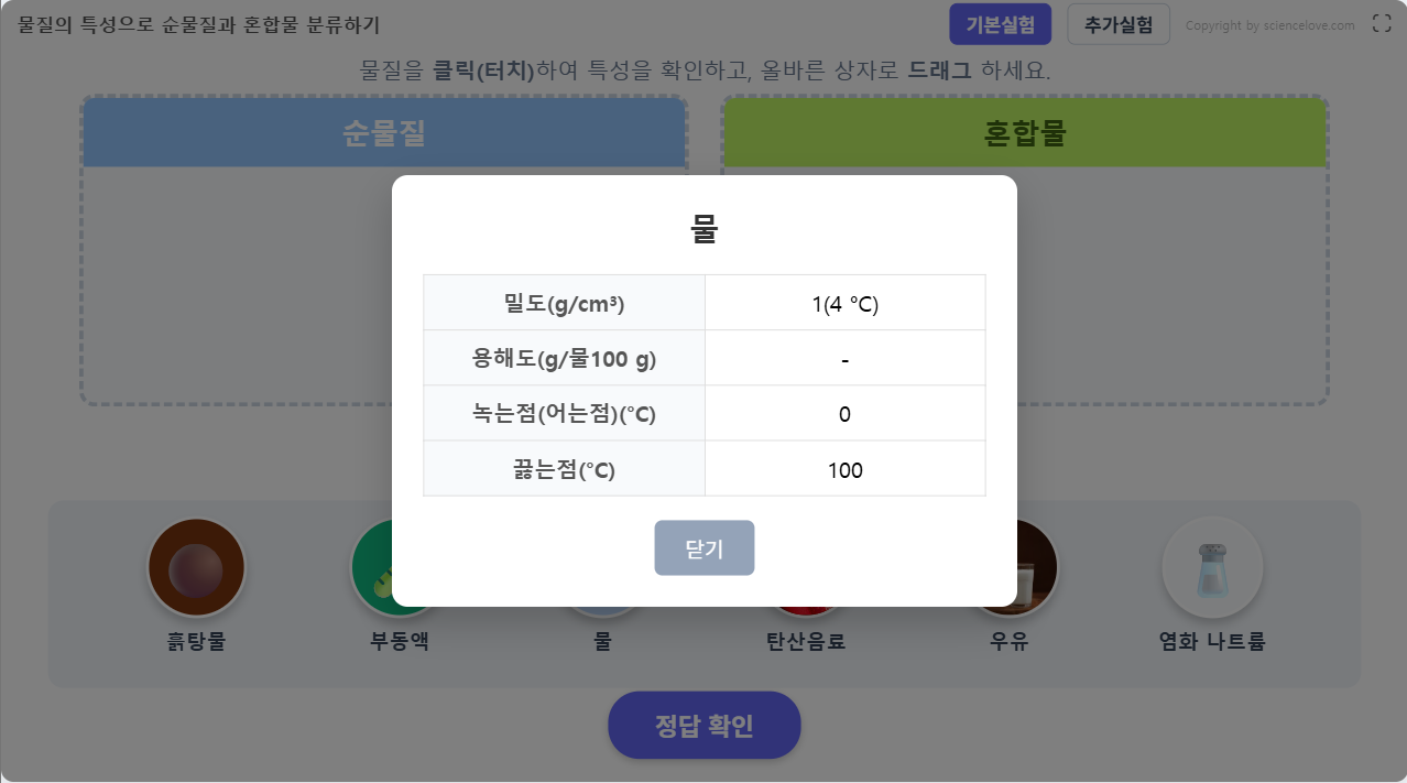 물질을 선택해서 확인해 보고, 분류해 보자.