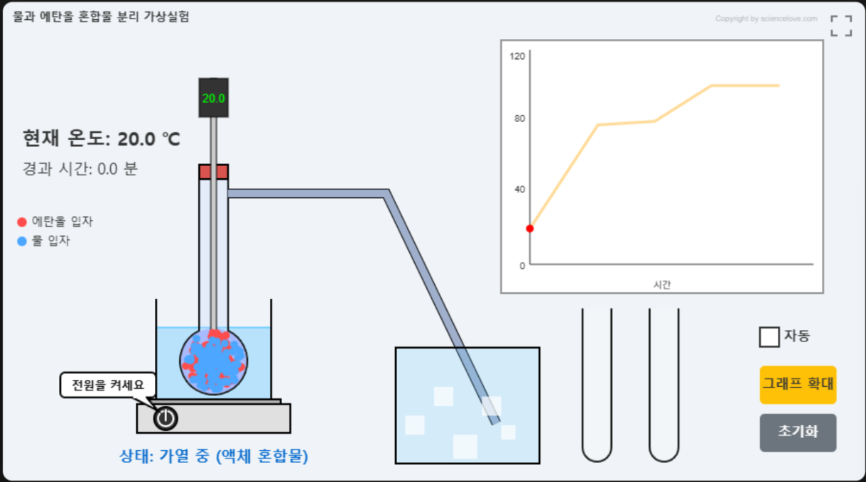 2개의 시험관을 이용하여 물과 에탄올 혼합물에서 물과 에탄올을 분리해 보세요. 전원을 켜고 시험관을 드래그 해서 발생한 기체를 모아 액화 시키면 됩니다. 자동에 체크하고 수행하면 자동으로 모든과정이 이루어 집니다. 에탄올 끓을때는 물과 혼합물이기 때문에 끓는점이 올라가는 것도 확인할 수 있습니다. 물도 일부 섞여 나오지요.