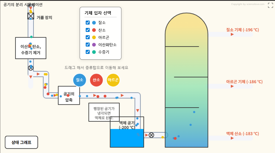 질소,산소,아르곤 가스를 증류탑 안으로 드래그 해 보면 올라가면 액체로 내려가면 기체로 바뀌어서 어디로 분리될지 예측할 수 있다.