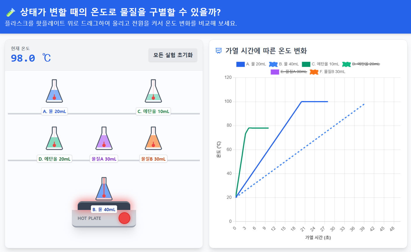 혼합물은 끓는점이 일정하지 않다는 것을 보여주려고 만들었던건데 순물질에서 끓는점이 물질의 특성인 이유를 설명할때 사용해도 될 것 같네요. 순수한 물은 100도에서 끓지만 소금물과 같은