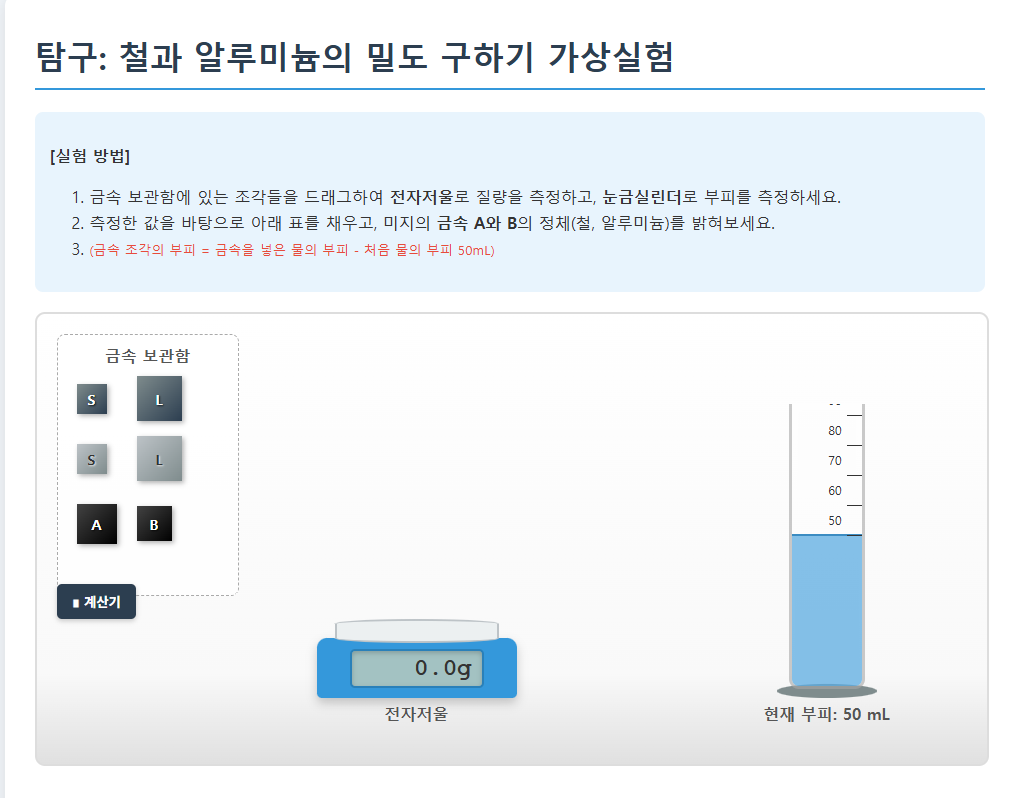 철과 알루미늄의 질량과 부피를 측정해서 기록하고 계산기를 통해서 밀도를 계산해서 기록한다.