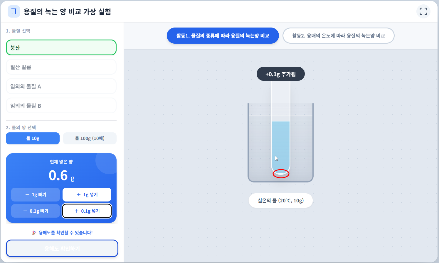 우선 왼쪽에서 물질을 선택하고 1g씩 넣어 보면 되, 만약 1g 을 넣었는데 결정이 생기면, 다시 빼고 0.1g 씩 넣어 보면 되