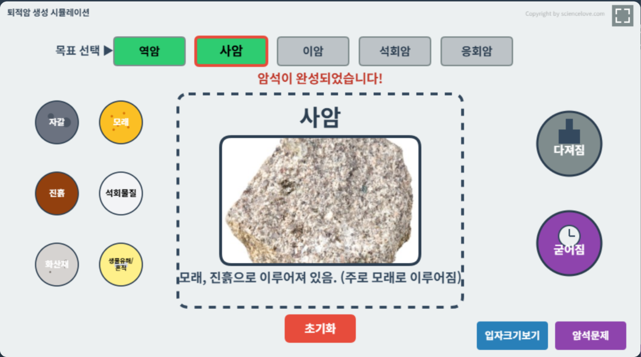 위에서 만들 암석을 선택하고, 왼쪽에서 재료를 가운데 작업공간으로 끌어다 놓은 다음, 오른쪽에 다져짐과 굳어짐을 끌어다 놓면 퇴적암이 생성된다. 만들고 싶은 퇴적암을 올바른 재료를 사용하여 만들어 보자. 화석 만들어지는 여부도 확인할 수 있다.