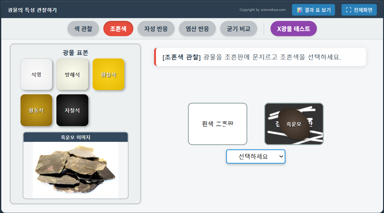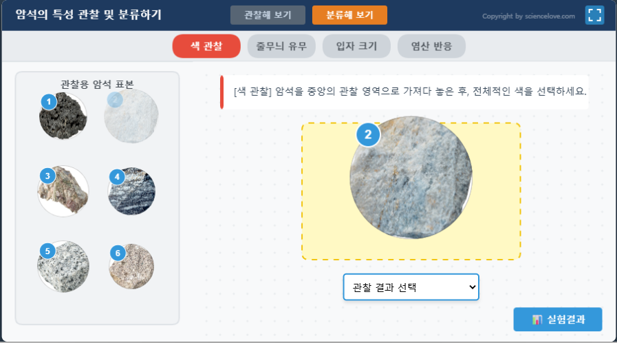 왼쪽에 암석을 끌어다 놓고 색, 줄무늬, 입자크기, 염산반응등을 관찰하고 관찰 결과를 기록할 수 있다. 나중에 실험결과를 눌러 제대로 했는지 확인할 수 있다.