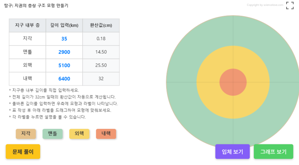 각 지구 내부층의 깊이를 정확하게 입력하면 환산된 값도 볼 수 있고 오른쪽 모형에 해당 내부층의 모습이 나타난다.