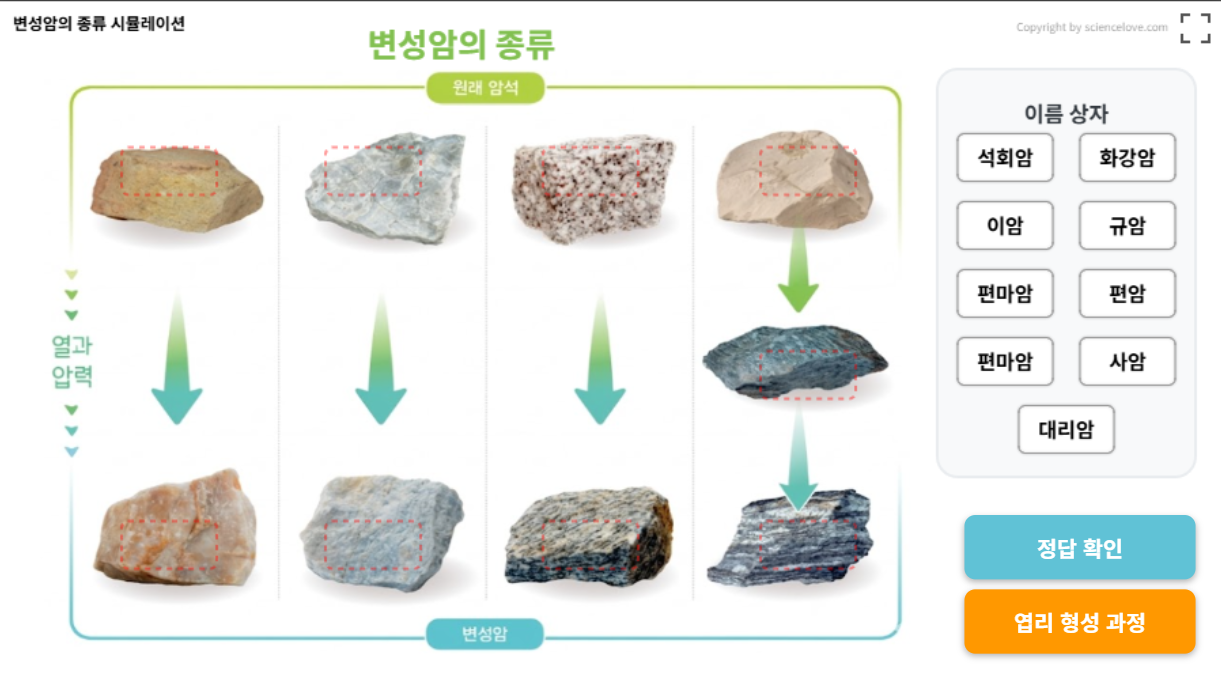 이름상자에 있는 암석이름들을 드래그해서 암석 사진위에 일치시키면 된다. 엽리형성과정에서는 엽리가 생기는 이유를 시연해 볼 수 있다.