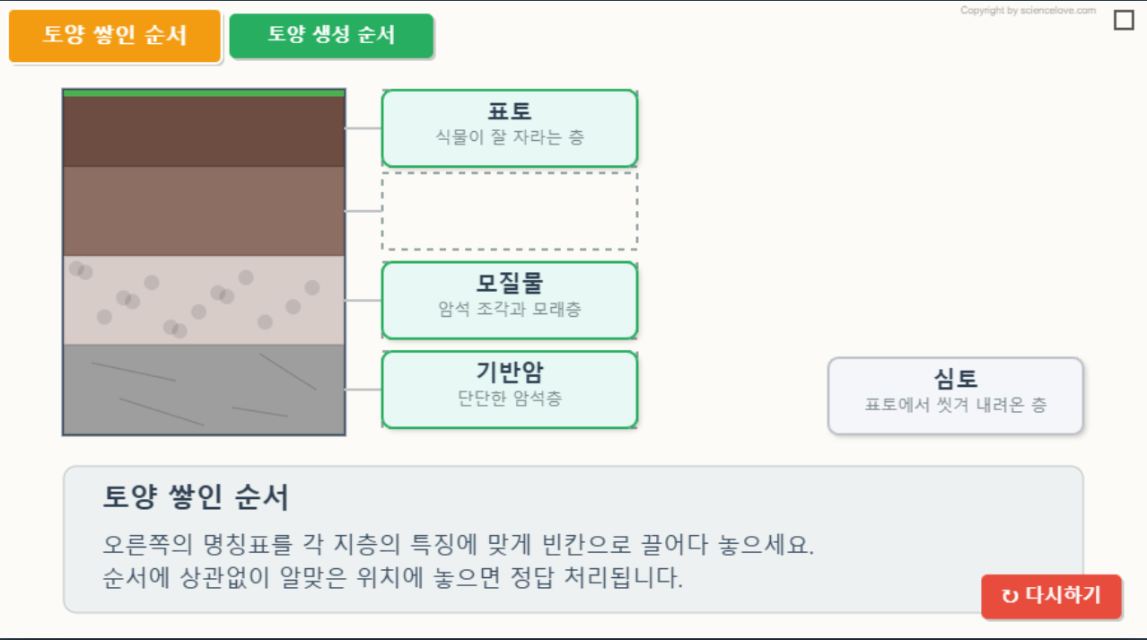 토양 쌓인 순서를 이름표를 끌어다 맞춰 볼 수 있고, 토양 생성 순서를 순서대로 진행시켜 볼 수 있습니다.