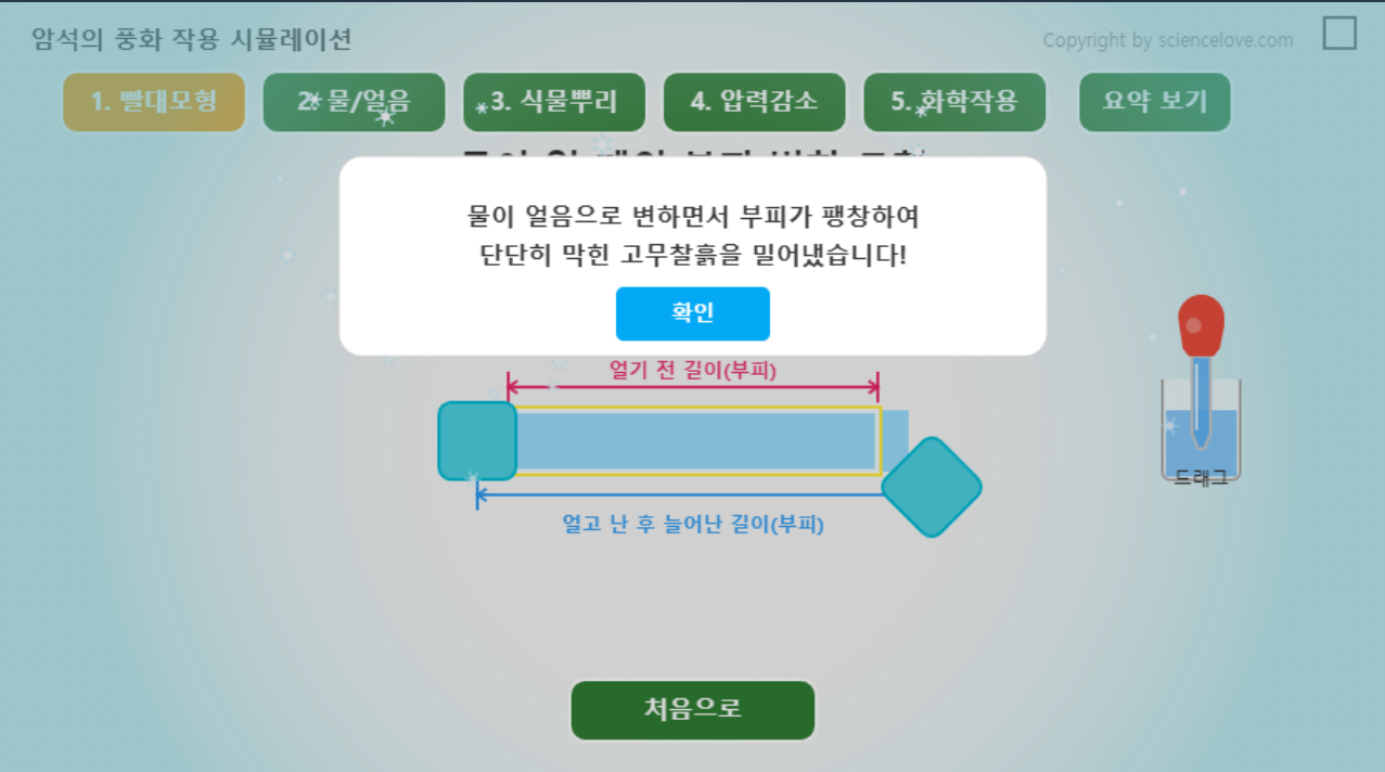 풍화작용 빨대와 고무찰흙을 가지고 물이 얼면 부피가 팽창하는 실험 해 볼 수 있고