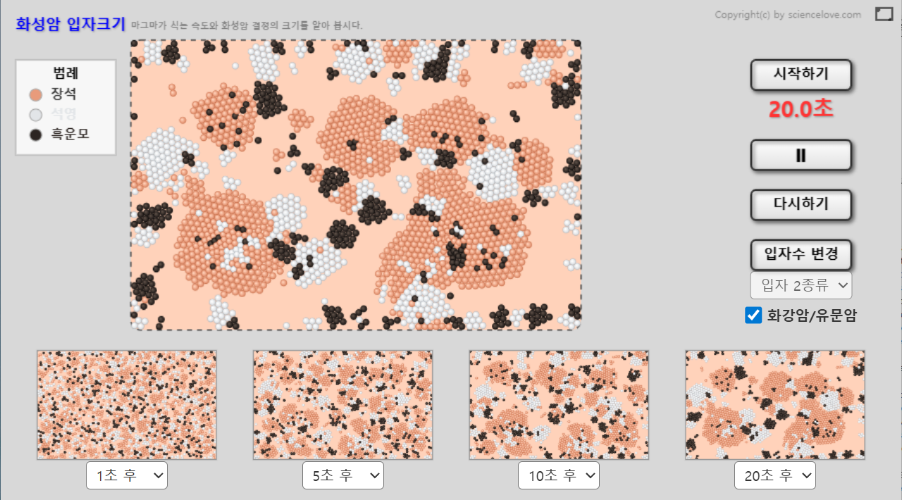시작하기를 누르면 아래쪽에 선택된 시간에 맞추서 화면이 저장된다. 광물들이 액체 상태로 녹아서 골고루 퍼져 있다가 시작하기를 누르면 같은 광물끼리 모이기 시작한다. 그런데 모이다가 1초후에 멈추면 결정의 크기가 작아서 거의 구별할 수 없다. 그런데 천천히 식어서 충분하게 모일 시간을 주면 20초 후에는 결정의 크기가 상당히 커진 걸 볼 수 있다.