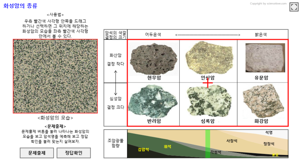 문제출제를 눌러 왼쪽 화성암 모습에 나타나는 화성암의 모습을 보고, 결정의 크기와 색깔을 관찰한 후 오른쪽에 어떤 화성암일지 예측해 보고 정답확인을 눌러서 자신의 생각이 맞았는지 확인해 보게 하자.