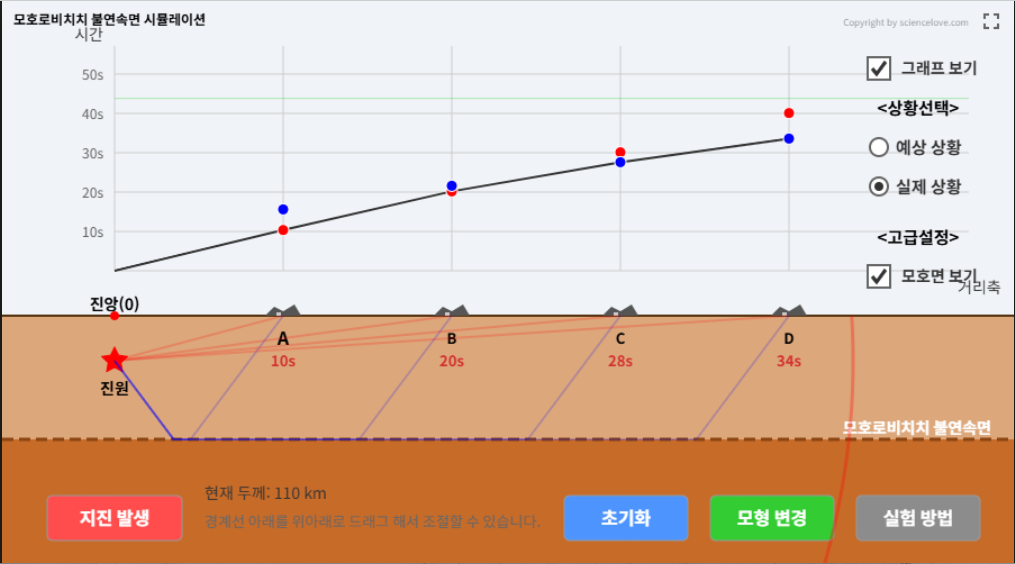 - 모호면 보기: 체크하면 숨겨져 있던 모호로비치치 불연속면(지각과 맨틀의 경계)이 나타나고, 맨틀을 통과하는 빠른 굴절파(파란색 원)의 경로를 볼 수 있습니다.