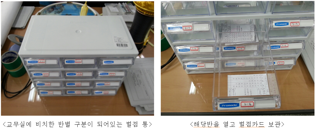 - 각반이 표시되어 있어서 벌점을 부여한 선생님은 각반 서랍을 열고 벌점카드를 넣으면 되고, 담당 선생님은 벌점을 입력후 각반 서랍 뒤쪽에 넣어서 누적 보관하도록 함