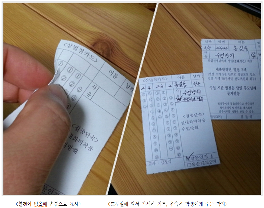 4) 벌점카드를 딱지 떼듯이 만들어 벌점을 부여하면 반쪽을 잘라 학생에게 줌 - 학생은 종례시간 이후에 담임에게 딱지를 제출해야 함. - 학생이 담임에게 딱지를 제출할 때 까지 보면서 계속 생각하게 됨. 심지어는 옆에 친구들에게 보여주면서 자신이 받은 벌점에 대해 이야기하게 되면 자연스럽게 주변학생들에게 홍보가 되어 잘못된 행동을 하면 안 되겠다는 생각을 하게 만듦. - 추후 담임선생님이 1번 더 지도하는 효과가 나타남 - 사전교육 철저