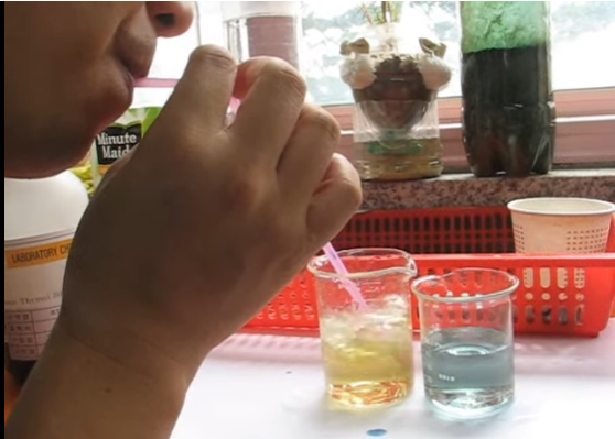 좀 지저분한면이 있지만 날숨에 의해 오줌으로 변한다는 생각에 BTB용액에 이산화탄소가 녹아들어가면 노란색으로 변한다는 것은
