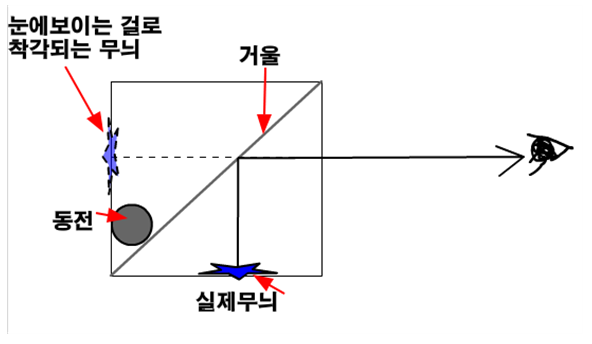 물체에 반사된 빛이 눈으로 들어와야 물체를 볼 수 있다. 그런데 저금통으로 들어간 동전은 저금통 사이에 대각선으로 위치한 거울 때문에 가려져서 볼 수 없게 된다. 대신 바닥에 있는 패턴 무늬가 거울에 반사되어 우리 눈으로 들어오게 된다. 그런데 우리는 우리눈으로 들어온 빛이 반사되어 왔는지를 알 수가 없다. 우리가 알 수 있는건 패턴무늬의 빛이 우리눈으로 들어왔다는 것만 알 수 있다.