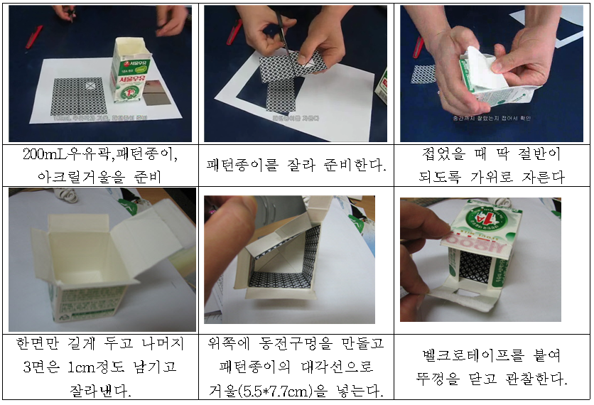 1. 200mL 우유곽을 깨끗이 씻고, 패턴종이와 아크릴거울, 벨크로테이프를 준비한다.