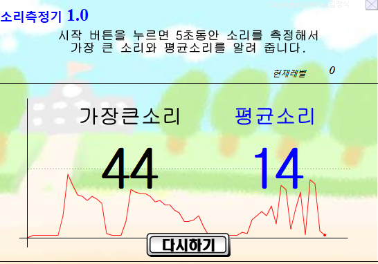 5초동안 함성이나 박수를 치게 해서 가장 크게 난 소리가 얼마였는지를 알려 줍니다.